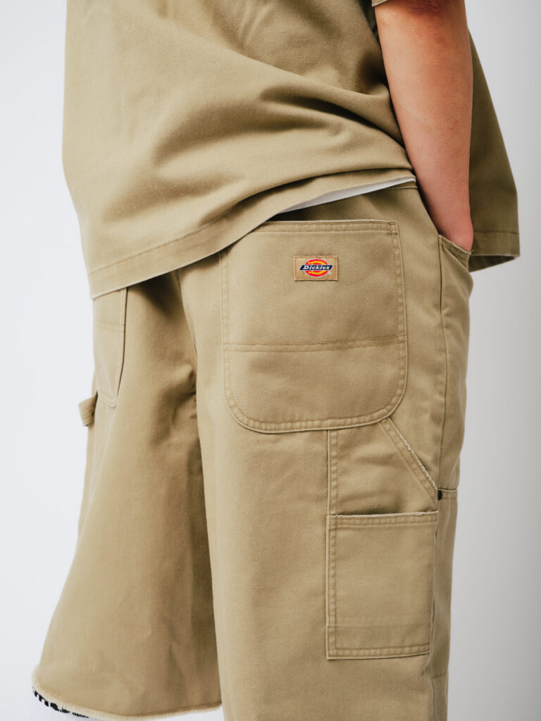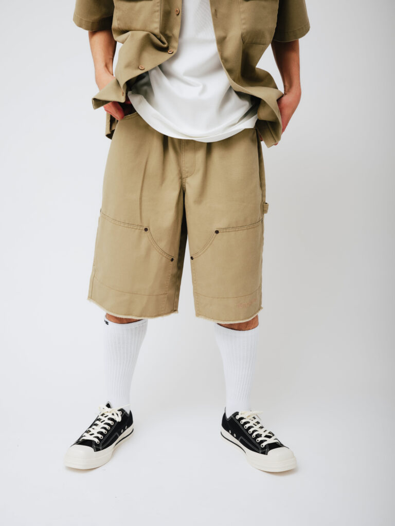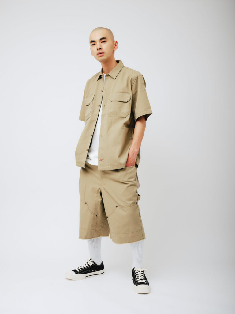Designed to resemble cut-off Dickies Double Knee Painter Pants, the pants feature an updated, relaxed waistband for an easy and comfortable fit. Echoing the shirt’s street-inspired vibe, “atmosphere” embroidery is placed near the raw, unfinished hem, adding a bold final touch.